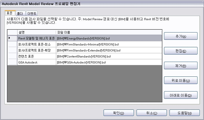 여기서 기존 검사(*.bcf)를 추가하고, 설명(친숙한 이름) 및/또는 표시 순서를 편집할 수 있습니다. 이 내용을 저장하면 검사 및 관리 드롭다운의 미리 정의된 리스트에 이 순서대로 표시됩니다. 이 설정은 설치 폴더에 있는 Model Review.config 파일에 저장되며, 여러 사용자가 함께 사용하려면 동일한 구성을 가져올 수 있도록 사용자 설치 폴더로 복사해야 합니다.