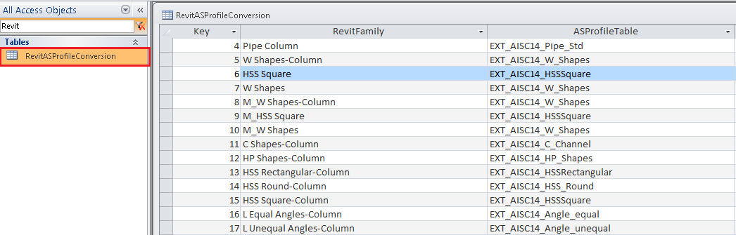 또한 AstorProfiles2016.mdb 내부에는 RevitASProfileConversion 이라는 새 테이블이 있습니다. 이 테이블은 Revit 패밀리 이름 키와 Advance Steel 프로파일 테이블 간 매핑을 저장합니다.