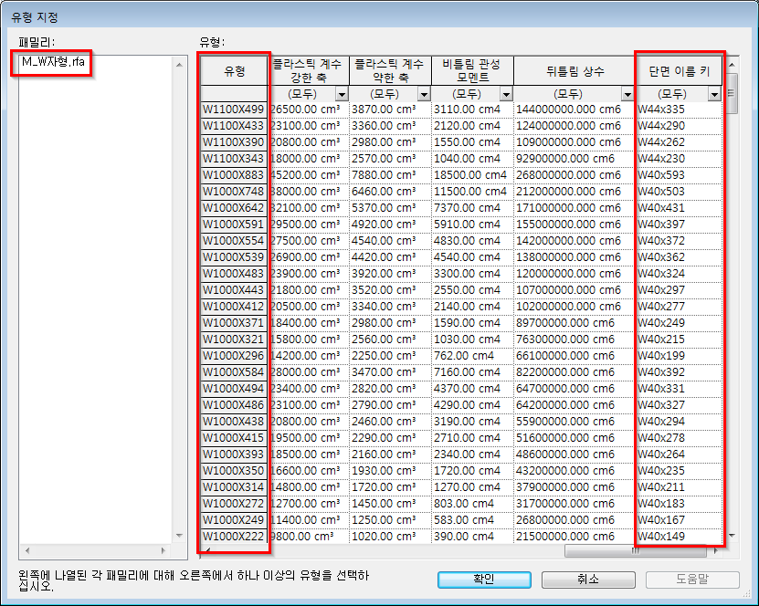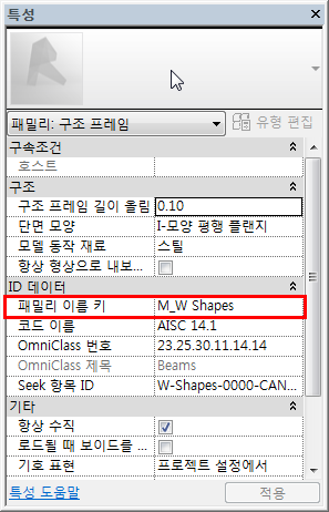 단면 이름 키 매개변수는 Advance Steel에서 프로파일의 단면 이름 값과 일대일로 매핑됩니다. 이 매개변수는 패밀리에 저장됩니다.