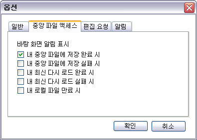 중앙 파일 문제에 대한 바탕 화면 알림을 수신하도록 지정하려면 옵션을 선택합니다. 이러한 바탕 화면 알림을 수신하지 않으려면 옵션을 선택 취소합니다.