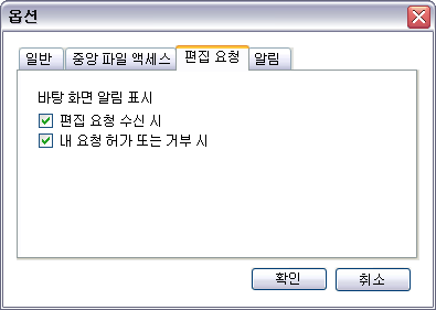 다른 사용자가 사용자에게 편집 요청을 보내거나 사용자의 편집 요청 중 하나가 허가 또는 거부될 때 바탕 화면 알림을 수신하도록 지정하려면 옵션을 선택합니다. 이러한 바탕 화면 알림을 수신하지 않으려면 옵션을 선택 취소합니다.