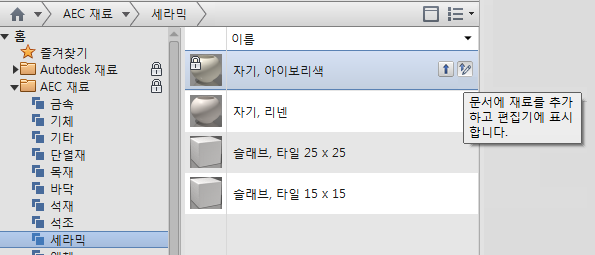 - 라이브러리 재료 리스트에서 재료를 클릭한 다음 추가-편집