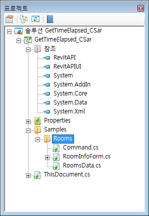 IDE 외부에서 Windows 탐색기를 사용하여 파일 시스템의 Revit 설치 폴더로 이동한 다음 AppHookup 폴더를 찾을 수 있습니다. 해당하는 ₩Samples₩Rooms 하위 폴더가 이 위치에 작성되어 있습니다.