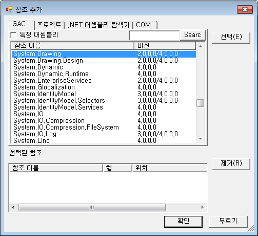 참조 추가 대화상자의 리스트에서 System.Drawing 및 System.Windows.Forms를 찾아서 선택합니다. 작업을 여러 개 선택하려면 Ctrl 키를 누른 채 선택합니다. 예는 다음과 같습니다.