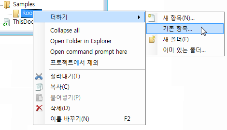 폴더 이름을 지정합니다. 이 예에서는 Samples라고 합니다. 그런 다음 Samples 폴더 항목을 마우스 오른쪽 버튼으로 클릭하고 추가