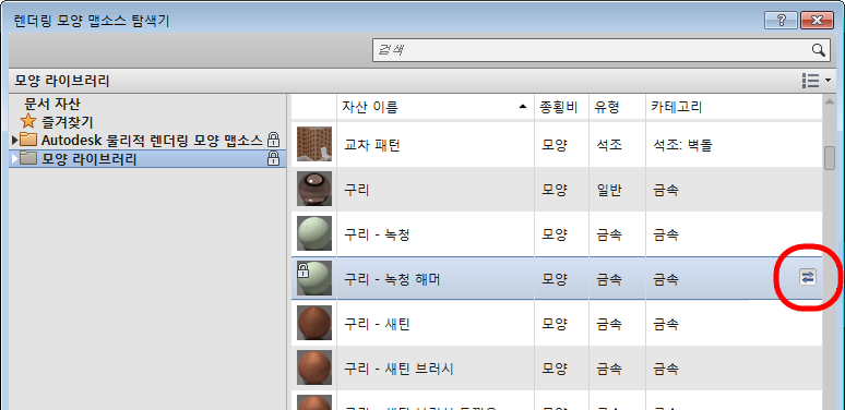 팁: 렌더링 모양 맵소스 탐색기에서 렌더링 모양 맵소스를 보다 쉽게 찾으려면 열 머리글 중 하나를 클릭하여 렌더링 모양 맵소스 이름, 외관, 유형 또는 카테고리를 기준으로 정렬합니다. 또한 렌더링 모양 맵소스 리스트 위에 있는 검색 막대를 사용할 수 있습니다.