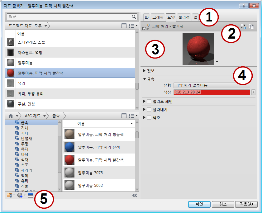 | 4 | 특성 패널: 선택한 렌더링 모양 맵소스의 세부 특성을 표시 및 관리합니다. 렌더링 모양 맵소스 이름 및 설명은 정보 드롭다운 패널 아래에 표시됩니다. 위의 이 예에서는 "피막 처리 - 빨간색" 모양 렌더링 모양 맵소스에 대해 표시(확장)되는 금속 특성을 보여줍니다. |