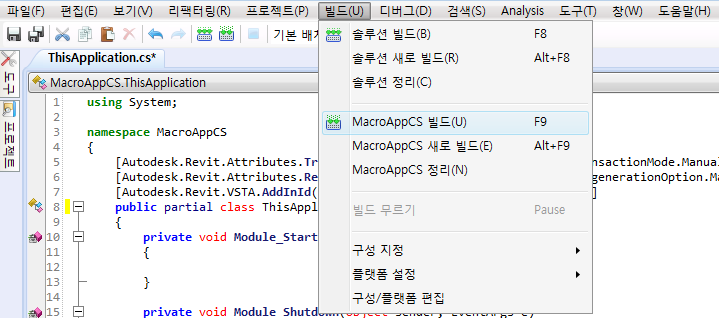 - Revit 매크로 IDE에서 작성 드롭다운 리스트의 매크로 관련 옵션을 선택합니다.