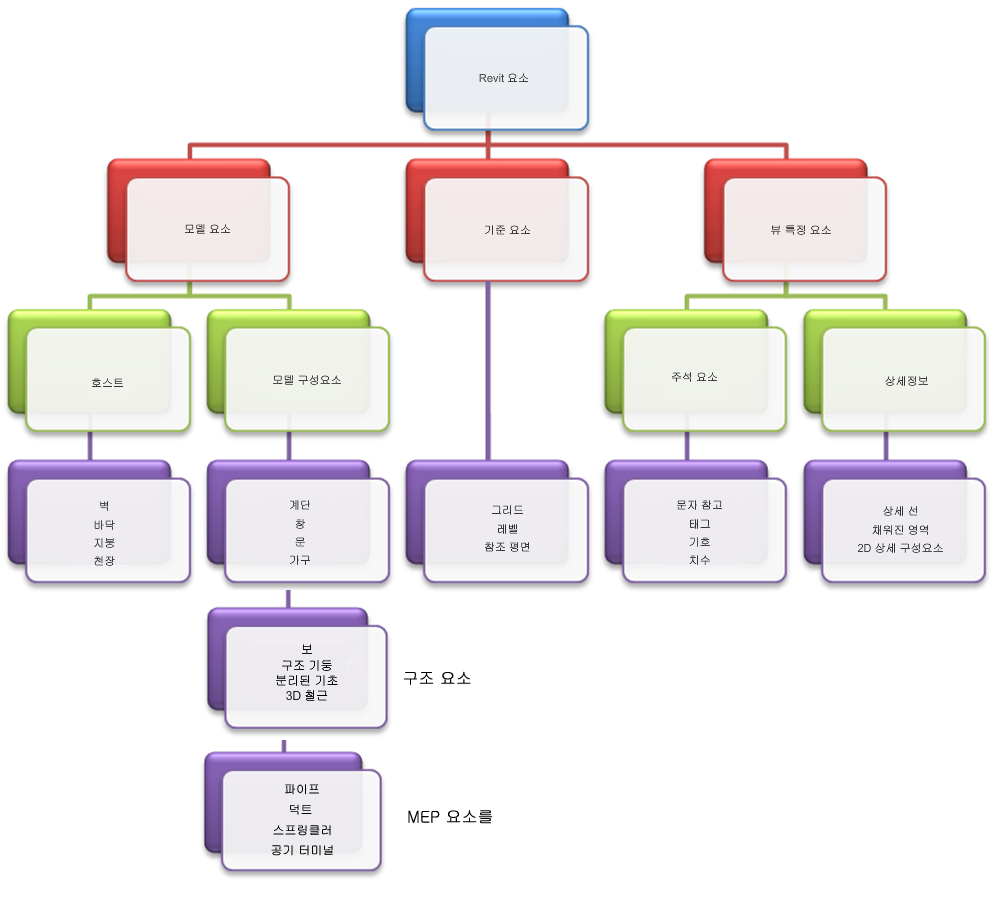 Revit에서는 프로젝트에서 세 가지 유형의 요소(모델 요소, 기준 요소 및 뷰별 요소)를 사용합니다. Revit의 요소도 패밀리로 참조됩니다. 패밀리는 요소의 형상 정의와 요소에서 사용되는 매개변수를 포함합니다. 요소의 각 인스턴스는 패밀리에 의해 정의되고 제어됩니다.