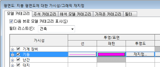 대부분의 가시성 및 그래픽 화면표시 재지정은 가시성/그래픽 대화상자에서 이루어집니다. 예외적으로 개별 요소 재지정은 뷰 특정 요소 그래픽 대화상자에서 수행됩니다.