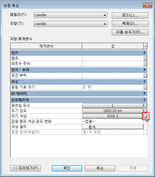 - 패밀리 카테고리 및 매개변수 대화상자의 패밀리 매개변수에서 광원을 선택합니다.