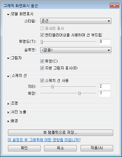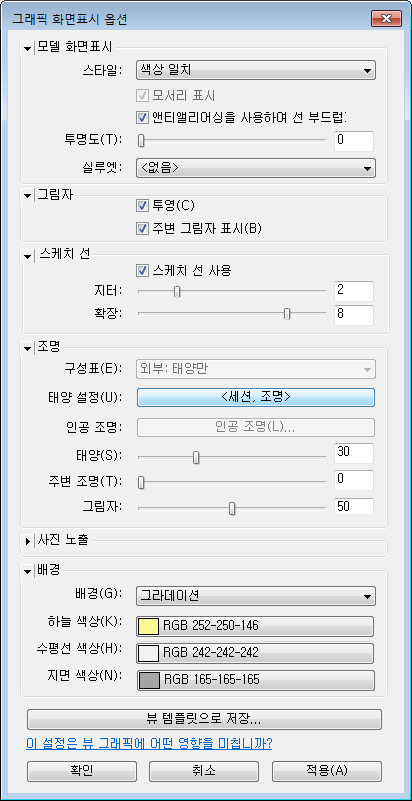 이 뷰는 그래픽 화면표시 옵션 대화상자에서 다음 설정을 사용합니다.