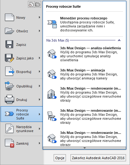 Proces roboczy Suite służy do przenoszenia danych rysunku między produktami oraz bardziej realistycznego i szczegółowego wyświetlania opracowanego projektu za pomocą renderowania lub animacji. Za pomocą procesu roboczego można na przykład przenieść rysunek programu AutoCAD do programu 3ds Max lub Showcase w celu szczegółowego renderowania za pomocą właściwości programu 3ds Max.