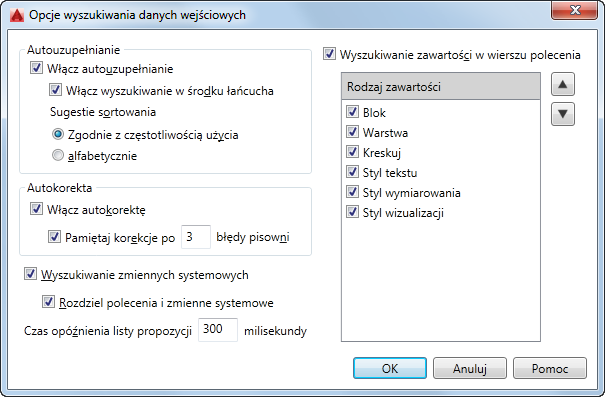 Steruje ustawieniami wyświetlania listy propozycji poleceń, zmiennych systemowych i nazwanej zawartości, takiej jak bloki i warstwy.