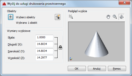 Wybiera obiekty do drukowania 3D i określa skalę lub rozmiar ich wydruku.