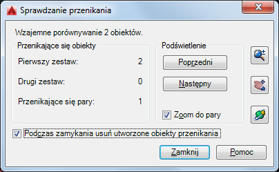 Wyświetla liczbę znalezionych przenikań między zaznaczonymi obiektami.