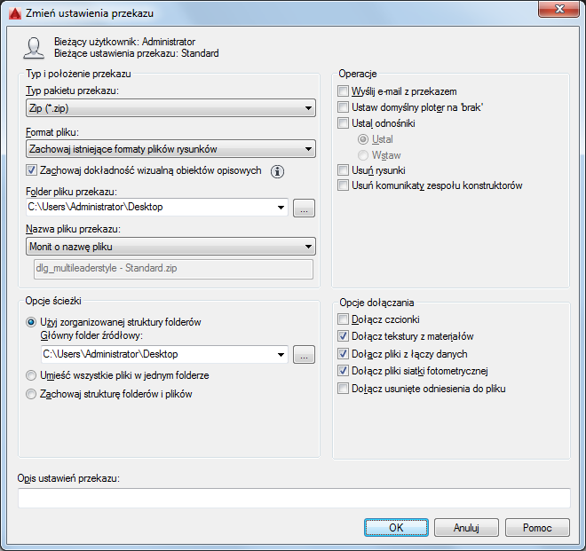 Jeśli pole to pozostanie niezmienione, plik przekazu zostanie utworzony w folderze zawierającym pierwszy wybrany plik rysunkowy. W przypadku zestawu arkuszy plik przekazu zostanie utworzony w folderze zawierającym plik danych zestawu arkuszy (DST). (Nie dotyczy programu AutoCAD LT).
