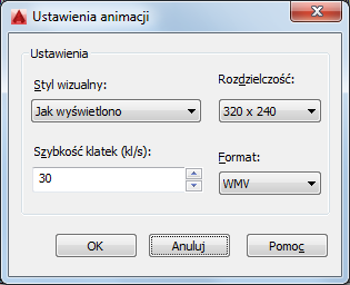 Określa listę formatów wyjściowych animacji. Dostępne formaty to AVI, MPG, WMV i MOV.