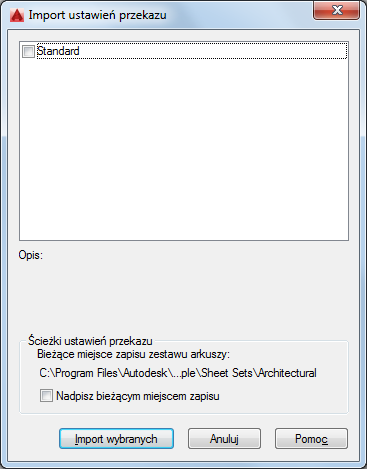 Wyświetla listę ustawień przekazu. Należy zaznaczyć te, które mają być zaimportowane do bieżącego zestawu arkuszy.
