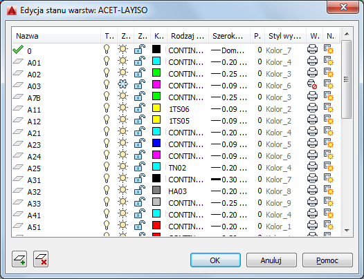 Wyświetla wszystkie warstwy i ich właściwości, które zostały zapisane w wybranym stanie warstw.