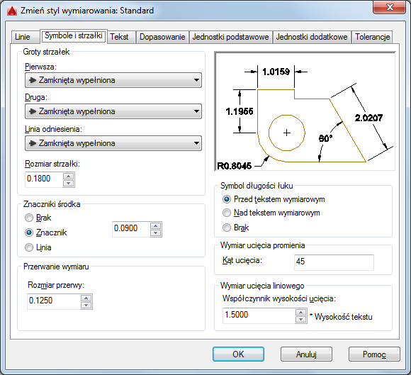 Określa kąt odcinka poprzecznego linii wymiarowej w wymiarze uciętego promienia. (DIMJOGANG — zmienna systemowa)