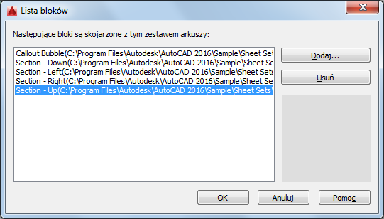 To okno dialogowe jest wyświetlane po kliknięciu przycisku Dodaj bloki w oknie dialogowym Kategoria widoku lub po kliknięciu przycisku [...] obok opcji Bloki objaśnień w oknie dialogowym Właściwości zestawu arkuszy.