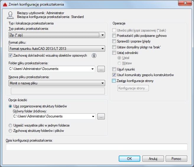 Jeśli to pole pozostanie niezmienione, plik przekształcenia zostanie utworzony w folderze zawierającym pierwszy określony plik rysunku. W przypadku zestawu arkuszy plik przekształcenia zostanie utworzony w folderze zawierającym plik danych zestawu arkuszy (DST).