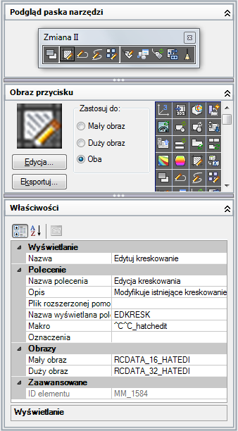 Panel Wyświetlanie dynamiczne zawiera podgląd elementu interfejsu użytkownika na panelu Dostosowywane pliki. Umożliwia edycję obrazu polecenia wybranego na panelu Lista poleceń oraz właściwości charakterystycznych dla elementu wybranego na panelu Dostosowywane pliki lub na panelu Lista poleceń.