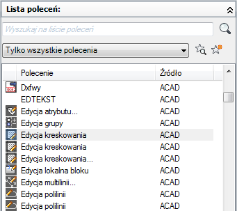 U góry panelu Lista poleceń znajduje się pole Wyszukaj na liście poleceń umożliwiające przefiltrowanie listy poleceń na podstawie wprowadzonego ciągu tekstowego. Ciąg tekstowy jest dopasowywany do dowolnej części nazwy polecenia, a wyniki są wyświetlane w polu Lista poleceń.