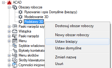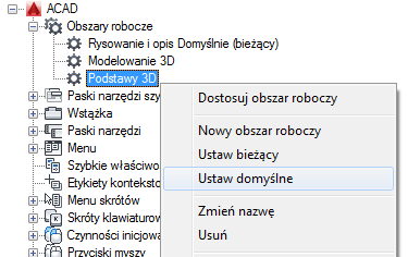 Obszary robocze w pliku CUIx mogą być oznaczane jako domyślne. Ustawienie obszaru roboczego jako domyślnego określa, że ma on zostać przywrócony podczas wczytywania pliku CUIx do programu po raz pierwszy lub po wczytaniu pliku CUIx za pomocą polecenia WCZYTAJCUI.