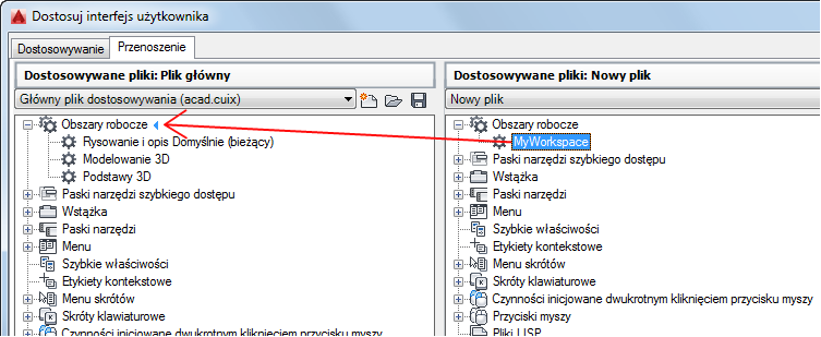 W panelu Dostosowywania w <nazwa pliku> (po prawej stronie) przeciągnij obszar roboczy z pliku CUIx do węzła Obszary robocze w głównym pliku CUIx w panelu Dostosowywania w <nazwa pliku> (po lewej stronie).