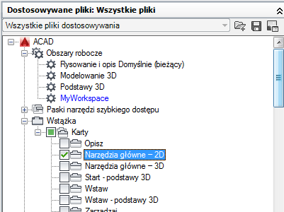 Uwaga: Obok węzłów paska narzędzi szybkiego dostępu, kart wstążki, pasków narzędzi, menu rozwijanych i częściowego pliku CUIx są teraz wyświetlane pola wyboru, więc można dodać elementy do obszaru roboczego.