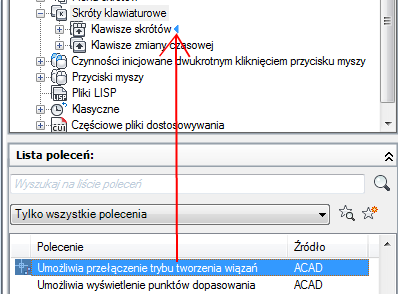 - Aby utworzyć klawisz skrótu, przeciągnij polecenie z panelu Lista poleceń do węzła Klawisze skrótów znajdującego się w panelu Dostosowywane pliki: <nazwa pliku>.