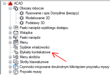 Jeśli właściwość jest zaznaczona, wówczas jest wyświetlana w etykiecie kontekstowej, gdy wskaźnik zostanie umieszczony na obiekcie tego samego typu w oknie rysunku. Należy usunąć znacznik wyboru znajdujący się obok właściwości, aby usunąć właściwość wybranego typu obiektu.