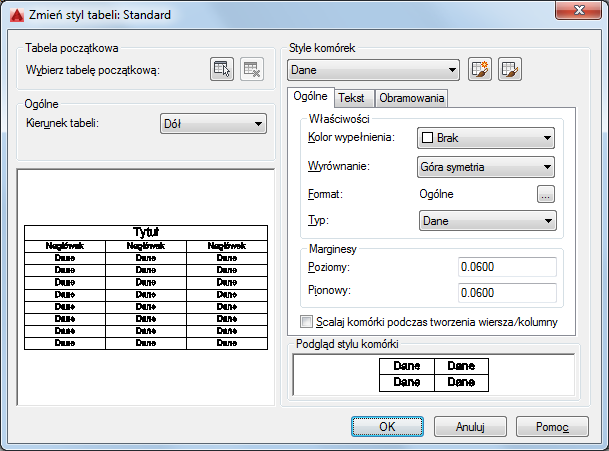 Umożliwia określenie tabeli w rysunku, która zostanie użyta jako przykład formatowania danego stylu tabeli. Gdy tabela zostanie wybrana, będzie można określić strukturę i zawartość, która ma być skopiowana z tabeli do stylu tabeli.