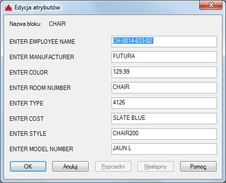 To okno dialogowe umożliwia zmianę wartości określonych atrybutów bloku. Aby zmienić właściwości atrybutu, takie jak położenie, wysokość i styl, należy użyć polecenia –ATRRED.