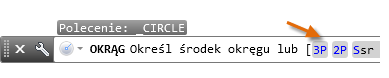 Ewentualnie można wpisać wyraz OKRĄG lub literę O w oknie polecenia i kliknąć, aby wybrać opcję. W takim przypadku można określić punkt środkowy lub kliknąć jedną z podświetlonych opcji polecenia, jak pokazano poniżej.