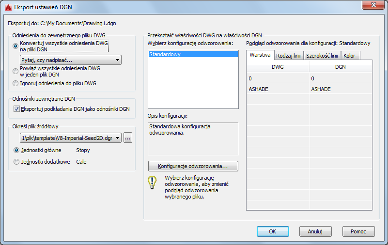 Wyświetla listę wszystkich właściwości eksportowanego pliku DWG (w kolumnie DWG) i wybranej konfiguracji odwzorowania (w kolumnie DGN).