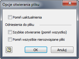 Nowa opcja Szybkie otwieranie w oknie dialogowym Opcje otwierania pliku umożliwia szybkie otwarcie rysunku. Po wybraniu opcji Szybkie otwieranie w ogóle nie jest podejmowana próba znalezienia ewentualnych plików, do których rysunek ma odniesienia, ani rozwiązania tych odniesień. Po otwarciu rysunek zachowuje się w taki sposób, jakby nie było w nim żadnych odniesień do plików. Można wprowadzać i zapisywać modyfikacje.