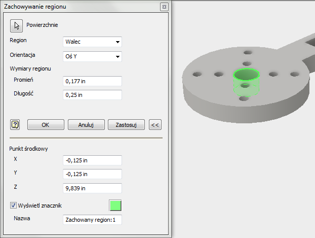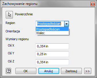 - W razie potrzeby rozwiń okno dialogowe Zachowaj region i zmień punkt środkowy oraz wymiary regionu. Istnieje również możliwość dopasowania orientacji regionu w kształcie walca. Po zakończeniu kliknij przycisk OK.