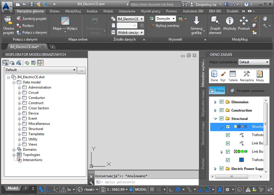 Szablony modeli branżowych wyświetlają dane modelu w oknie Eksplorator modeli branżowych po lewej stronie i zestaw wstępnie zdefiniowanych branżowych klas elementów w oknie zadań po prawej stronie. Wstążka Konserwacja obszaru roboczego została zoptymalizowana dla modelu branżowego.