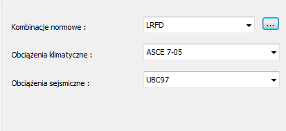 - Obciążenia sejsmiczne — kliknięcie w strzałkę znajdującą się na końcu tego pola powoduje rozwinięcie listy norm, z której wybrana może zostać norma używana podczas analizy sejsmicznej konstrukcji.