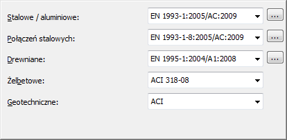 Jeśli z listy wyboru wybrana zostanie norma Eurocode, to po prawej stronie listy wyboru pojawia się dodatkowy przycisk (…), którego naciśnięcie powoduje otwarcie okna dialogowego Współczynniki częściowe, pozwalającego na edycję współczynników materiałowych dla modułów normowych.