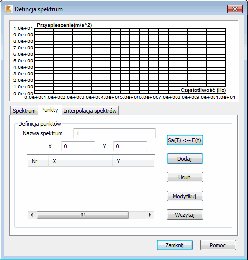 Zdefiniowane wcześniej widmo może być modyfikowane. Po wybraniu odpowiedniego punktu na liście punktów definiujących widmo współrzędne punktu prezentowane są w polach X i Y. Aby zmodyfikować współrzędne tego punktu, należy wpisać nowe współrzędne w polach X i/lub Y, a następnie nacisnąć przycisk Modyfikuj.