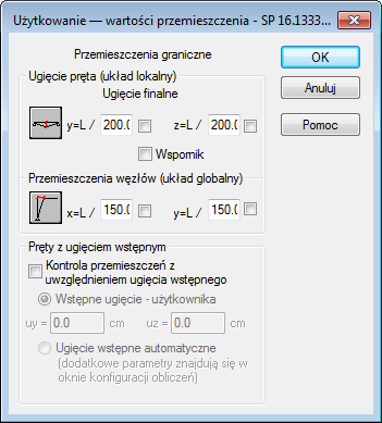 To okno dialogowe służy do definiowania dodatkowych parametrów określających wartości przemieszczenia granicznego.
