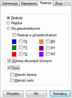 Po wybraniu karty Reakcje w oknie dialogowym Wykresy dla prętów okno przyjmuje postać pokazaną na poniższym rysunku: