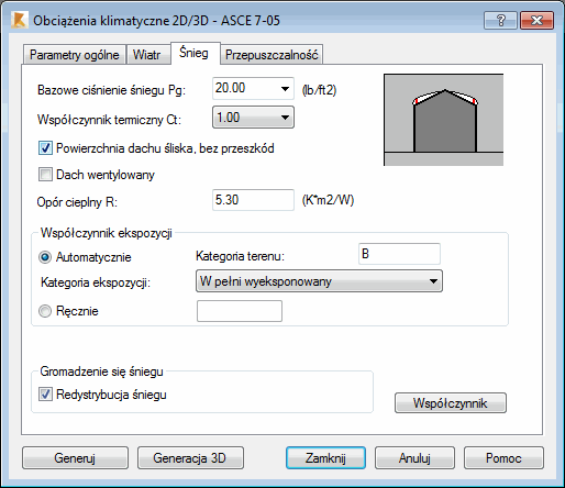 - W polu Gromadzenie śniegu opcja Niezrównoważone obciążenie powodowane przez śnieg generuje obciążenia powodowane przez zalegający śnieg, które uwzględnia przesuwanie się masy śniegu po nachylonym dachu, opady śniegu, jak również nagromadzony śnieg za pomocą różnych odwzorowań dachu (rynny i odpływy). Domyślnie, obciążenia powodowane przez śnieg są generowane z uwzględnieniem niezrównoważonych obciążeń dachu powodowanych przez śnieg.