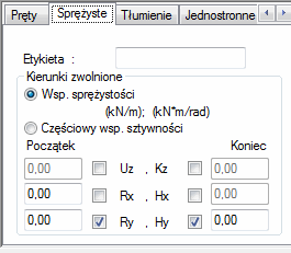 Definicja zwolnienia sprężystego polega na podaniu etykiety zwolnienia, wybraniu zwolnionych stopni swobody na początku oraz końcu elementu prętowego oraz określeniu: