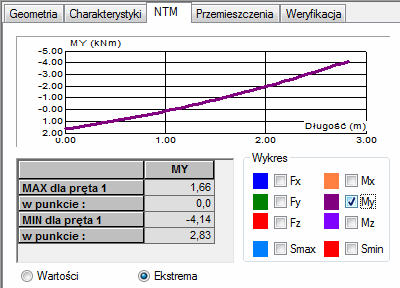 W górnej części okna dialogowego znajduje się wykres wybranej w polu Wykres wielkości. Na wykresie prezentowany może być wykres tylko jednej wielkości. Dostępne są wykresy następujących wielkości: sił FX, FY i FZ, momentów MX, MY, MZ oraz naprężeń Smax i Smin. Wykresy są przerysowane, jeżeli zmieniony zostanie przypadek obciążenia konstrukcji.