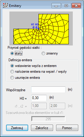 Emitery są węzłami definiowanymi przez użytkownika, w których pobliżu siatka elementów skończonych będzie zagęszczana. Opcja dostępna jest: